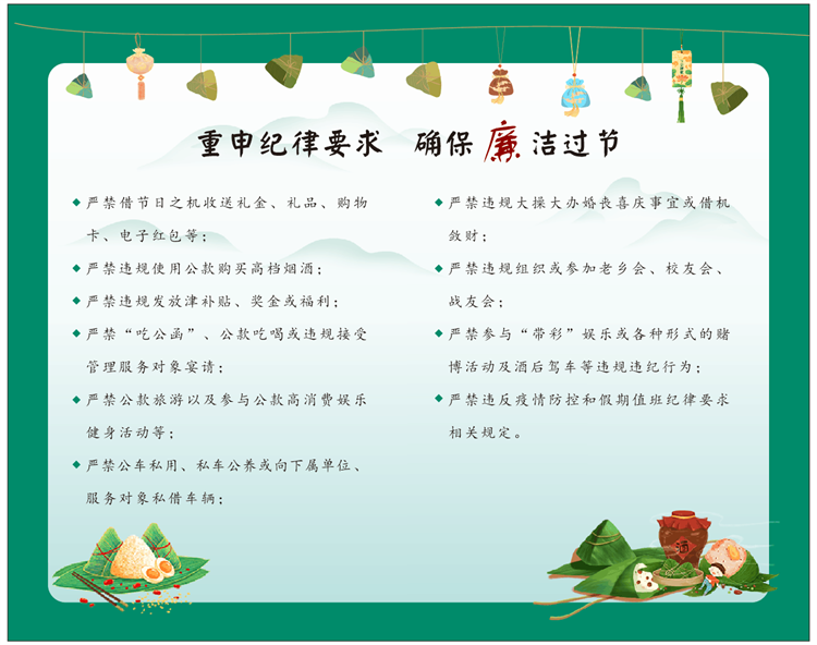 定制廉潔提醒卡。端午廉潔提醒卡內(nèi)容經(jīng)過精選,融合廉潔提醒、“十個(gè)嚴(yán)禁”、端午詩詞鑒賞等內(nèi)容,在品味端午文化的同時(shí),為全體黨員干部職工擰緊紀(jì)律“發(fā)條”,確保風(fēng)清氣正過端午。